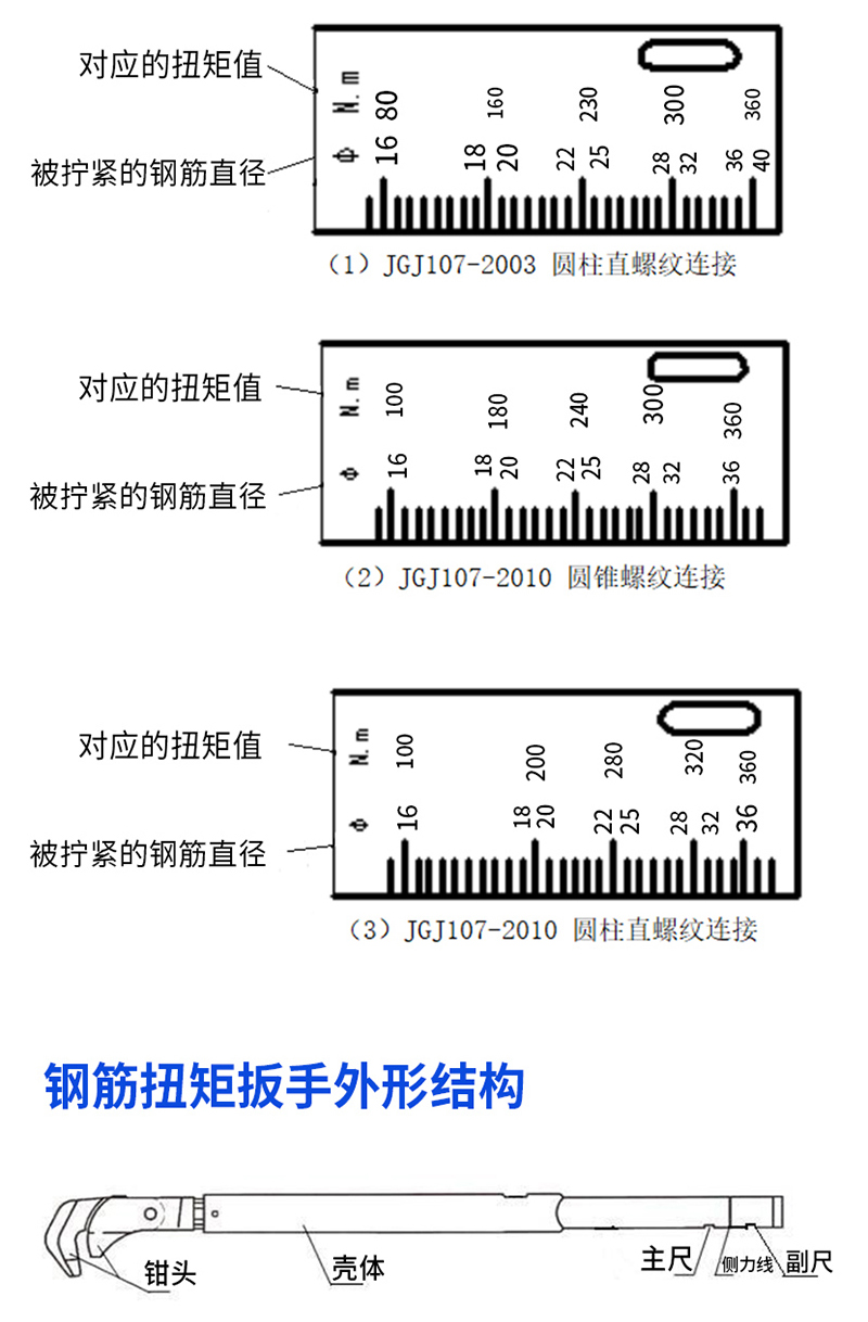 本產(chǎn)品適用于鋼筋直徑中16~$4Omm,扭矩范圍在100~360 N.m的鋼筋螺紋連接。主尺示值窗顯示使用的鋼筋直徑與對應(yīng)的扭矩值,每一小格10N.m,副尺微調(diào)窗口用于微調(diào),每一小格是1N.m。