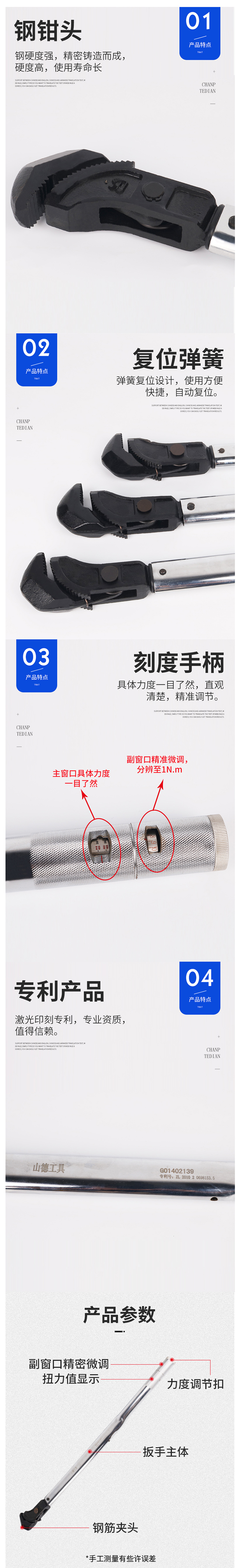 3、操作方法∶新扳手出廠時經(jīng)過檢驗,有產(chǎn)品合格證,力矩值設(shè)定在最低位置上,使用前,要根據(jù)鋼筋接頭所需要的擰緊力矩,將扳手上的游動標尺刻度值設(shè)定在對應(yīng)的位置上,即用專用扳手扭轉(zhuǎn)絲杠使游動標尺上的鋼筋規(guī)格刻度對準扳手柄上刻線,微調(diào)窗口標尺對零,然后將鉗口平穩(wěn)咬住被連接鋼筋或套筒,用力握住扳手手柄,順時針均勻加力,當聽到“咔咔”聲響時,既可停止加力,此時鋼筋接頭的擰緊力矩值已達到規(guī)定的要求。